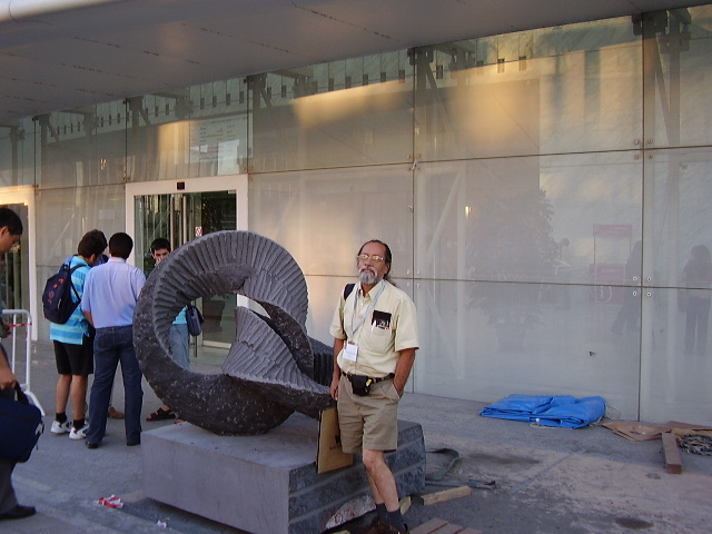 Keizo Ushio , escultor japonés junto al toro de granito que transformaría en cuatro cintas de Moebius.
